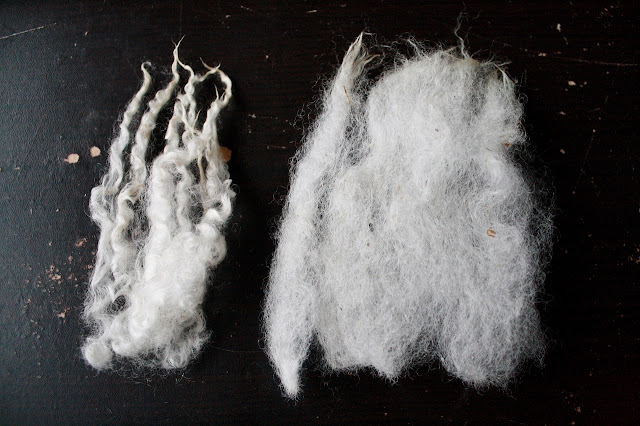my two wool fleeces arrived in Monday's mail, and i was super-excited to get my hands on them... after which i washed said hands... twice. i grabbed a quick sample from each bag, and spent some time in a state of deep contemplation.